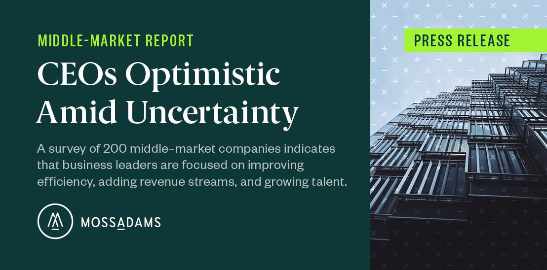 This random double-opt-in survey of 200 American business owners and CEOs of businesses that have $50 million to $500 million in yearly revenue was commissioned by Moss Adams between Oct. 1 and Oct. 9, 2024. It was conducted by market research company Talker Research, whose team members are members of the Market Research Society (MRS) and the European Society for Opinion and Marketing Research (ESOMAR).