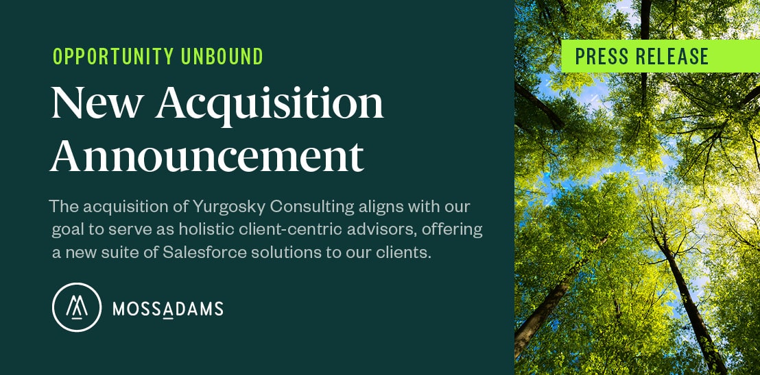 Through the acquisition, Moss Adams continues to expand its applications business, leveraging Yurgosky’s deep Salesforce experience and success in developing applications to meet clients’ unique needs. The added capabilities provide Moss Adams a springboard from which the firm can extend its applications products and services, building on Yurgosky’s portfolio and bringing these solutions to new industries.