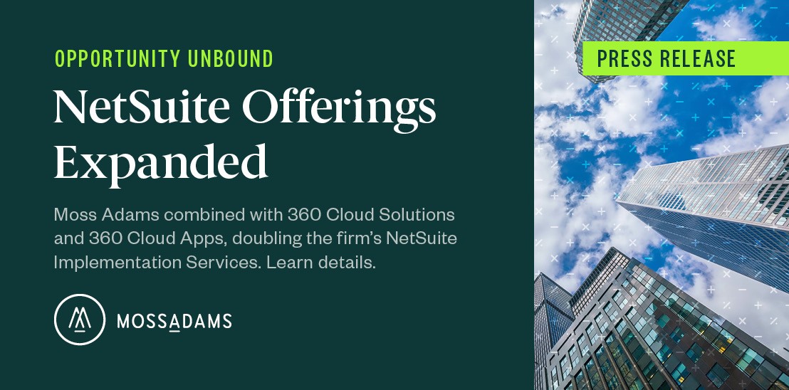 SEATTLE, Feb. 4, 2025—Moss Adams, one of the largest accounting, consulting, and wealth management firms in the nation, announced it acquired assets of 360 Cloud Solutions, LLC, a NetSuite Solution Provider, and 360 Cloud Apps, LLC, a SuiteCloud Developer Network partner and producer of the 360 Cloud Subscription Billing product. The 360 Cloud Solutions and 360 Cloud Apps teams joined Moss Adams effective January 31, 2025.