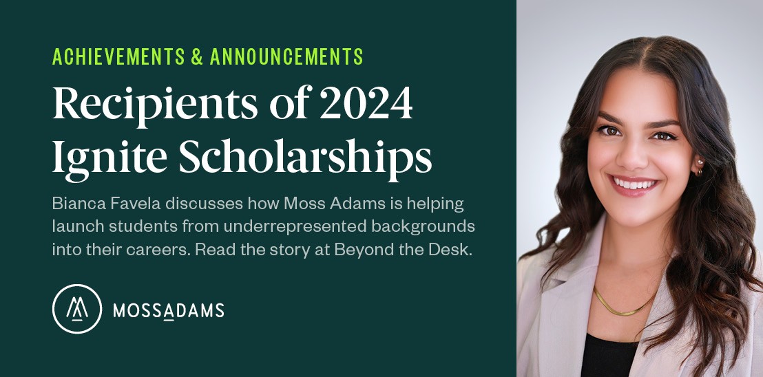 Since joining Moss Adams in 2022, Bianca has observed the growth of the Ignite Scholarship program and its impact on historically underrepresented students pursuing a career in the accounting industry. In the 12 years since the program’s inception, 28 Ignite Scholarship recipients have been hired for internships and full-time positions. Bianca hopes the program continues to grow.