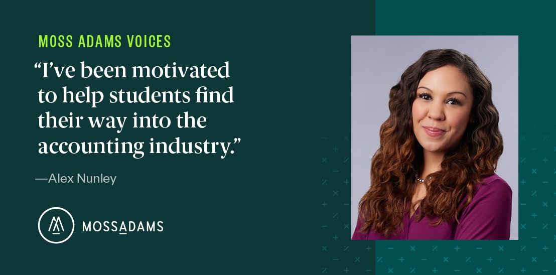 While in school, Alex was one of the few Black students who majored in accounting. Now, as a partner at Moss Adams, she’s proud to share her journey and inspire the next generation of talent seeking to begin theirs.