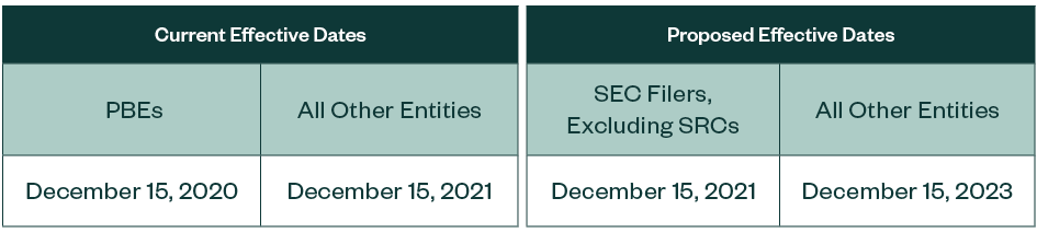 Determining whether or not an entity is eligible to be classified as an SRC would be based on an entity’s most recent determination in accordance with SEC regulations when the final update is issued. Early application is permitted for all entities under this proposed update.
