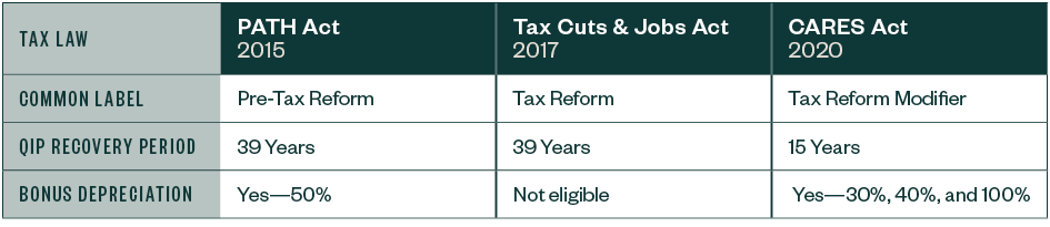 The CARES Act addressed the technical drafting error and now allows QIP assets to be depreciated over 15 years, making them eligible for bonus depreciation. These changes  retroactively apply to assets placed into service in 2018. The IRS has released procedures for addressing and approaching depreciation changes for QIP assets in service in 2018 and 2019 for returns that have already been filed.