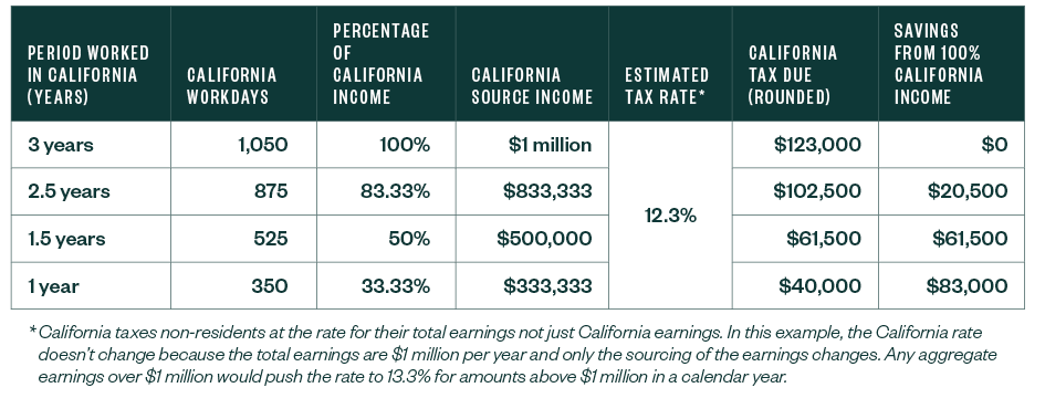 If your employer gives you the opportunity to move, doing so may provide an opportunity to cap your number of California workdays and secure significant tax savings. If your number of total workdays is fixed, then you can calculate the ratio to determine potential tax savings.