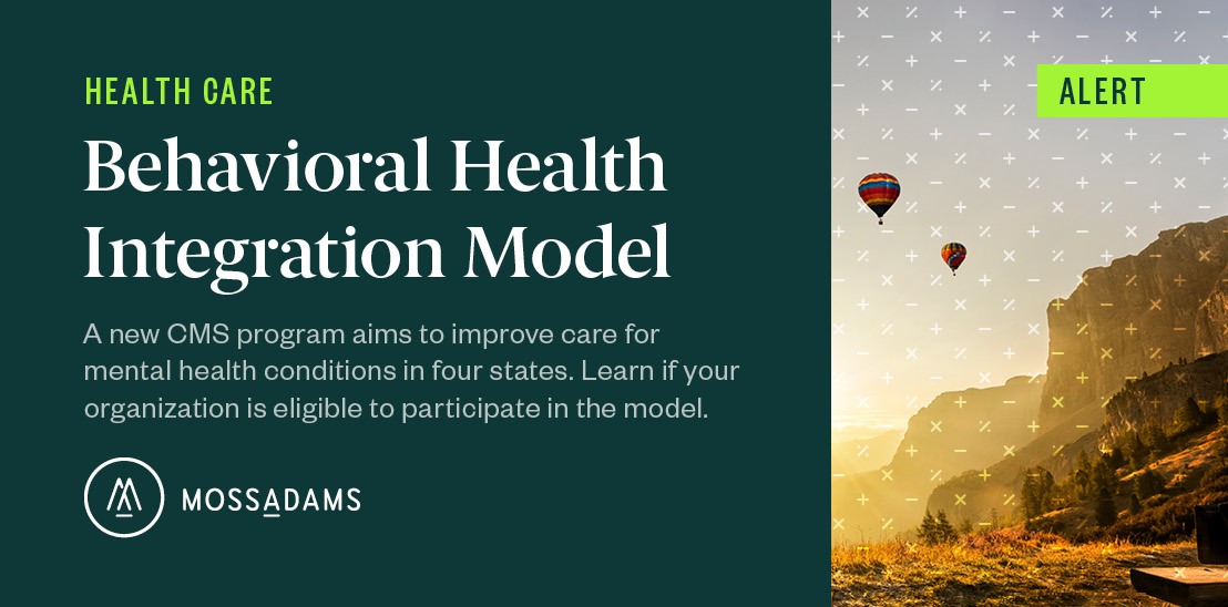 If you’re interested in applying to the IBH Model, please contact your Moss Adams professional. Our health care strategy team can provide more information about program benefits, requirements, and support with operational and financial planning.
