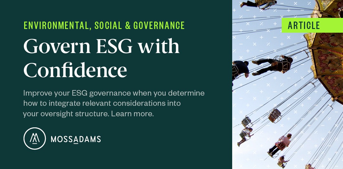 For guidance on developing and implementing an ESG strategy for your company, or if you want to increase the efficiency of your already established ESG oversight, contact your Moss Adams professional.