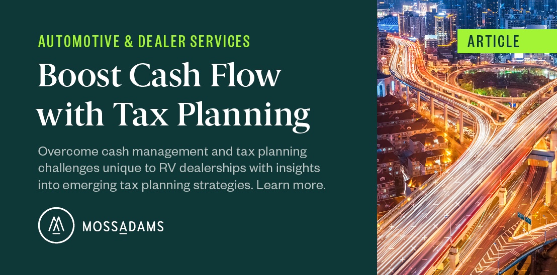 To learn more about tax planning strategies specific to RV dealerships and how they can benefit your business, contact your Moss Adams professional.