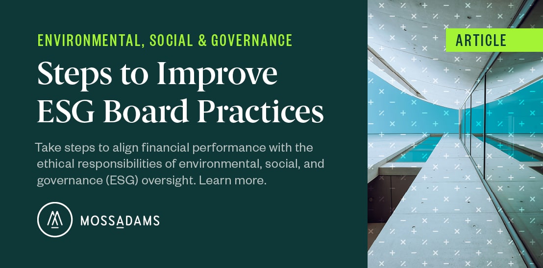 For guidance on developing and implementing an ESG strategy for your company, contact your Moss Adams professional.