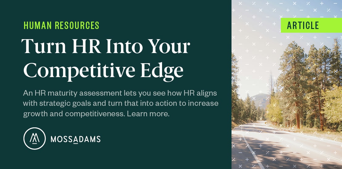 To learn more about conducting an HR maturity assessment in your organization, contact your Moss Adams professional.