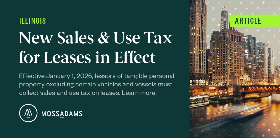 Effective January 1, 2025, lessors of TPP other than motor vehicles, watercraft, aircraft, and semi-trailers required to be registered with the state, are now considered to be a retailer subject to Illinois’ sales and use tax laws and must register with the Illinois Department of Revenue.