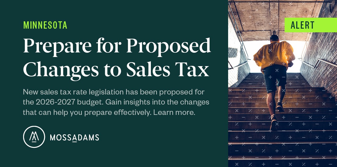 To learn more about Minnesota’s proposed sales tax legislation, how it can impact your business, and how to prepare effectively, contact your Moss Adams professional.
