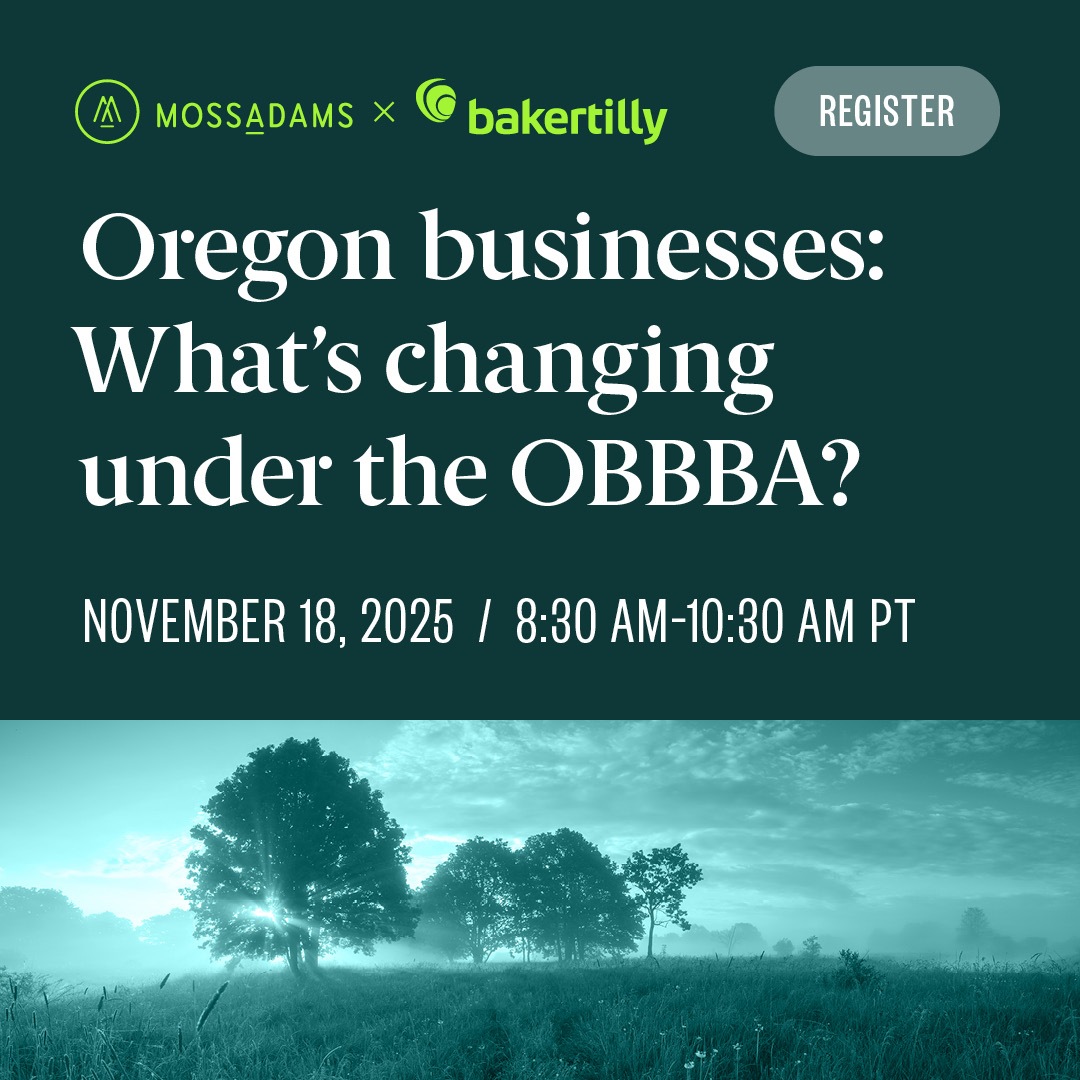 Ready for what’s next? Navigate policy shifts with confidence. Join leaders from Baker Tilly, Oregon Business & Industry, and the Eugene Area Chamber of Commerce at our event, Oregon Tax Outlook: Big Beautiful Bill and Local Impact, as they cut through the noise to explain what’s changing under the One Big Beautiful Bill Act (OBBBA) as well as state and local developments, and what it means for your business and personal planning.