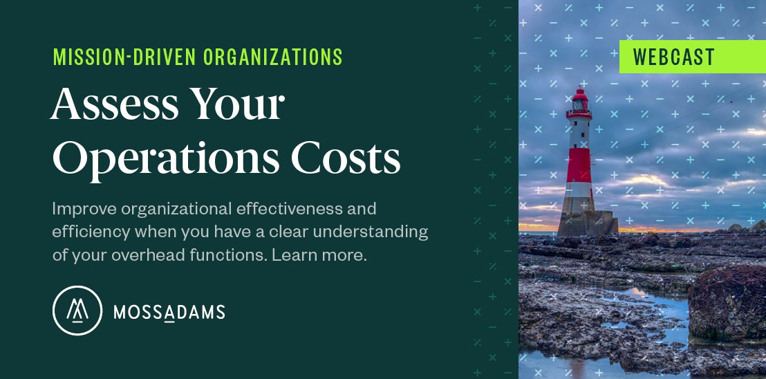 Join us for our webcast, Navigating Overhead Functions in Mission-Driven Organizations. Our internal service specialists will discuss how to improve the cost-effectiveness and efficiency of overhead functions.