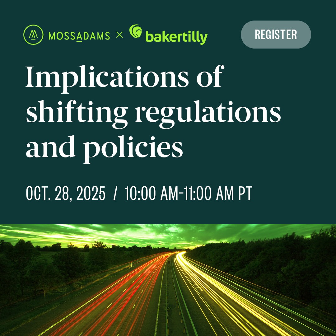 Baker Tilly US, LLP, Baker Tilly Advisory Group, LP and Moss Adams LLP and their affiliated entities operate under an alternative practice structure in accordance with the AICPA Code of Professional Conduct and applicable laws, regulations and professional standards. Baker Tilly Advisory Group, LP and its subsidiaries, and Baker Tilly US, LLP and its affiliated entities, trading as Baker Tilly, are members of the global network of Baker Tilly International Ltd., the members of which are separate and independent legal entities. Baker Tilly US, LLP and Moss Adams LLP are licensed CPA firms that provide assurance services to their clients. Baker Tilly Advisory Group, LP and its subsidiary entities provide tax and consulting services to their clients and are not licensed CPA firms. ISO certification services offered through Moss Adams Certifications LLC. Investment advisory offered through either Moss Adams Wealth Advisors LLC or Baker Tilly Wealth Management, LLC.