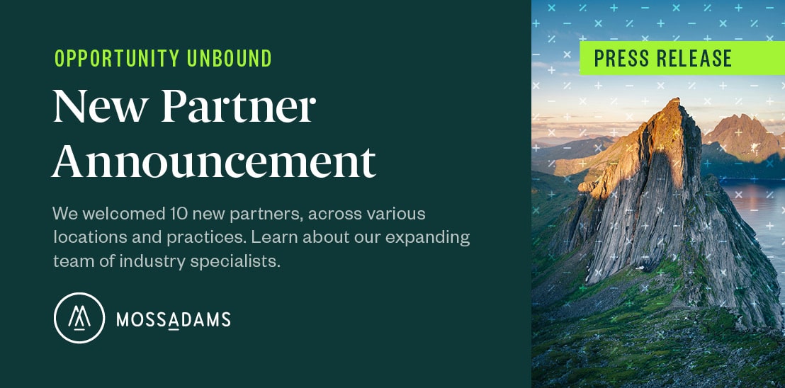 “As business becomes more complex, technology progresses and the regulatory environment shifts, today’s leaders must excel at being in tune with the unique needs of each organization,” said Eric Miles, chairman and CEO of Moss Adams. “This new class of partners represents our dedication to meeting clients’ needs, advising them as they pursue growth and their objectives.”