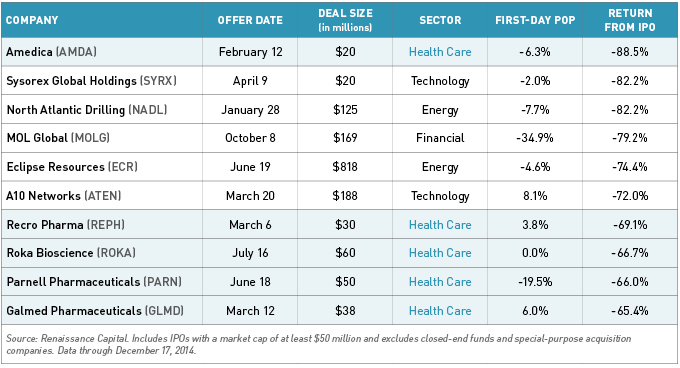Over the last year, the market for US initial public offerings (IPOs) set a 14-year record, making it the most active year of issuances since the dot-com boom. The 273 IPOs successfully offered in 2014 represented a 23 percent increase over the prior year, which was also booming with IPOs. Meanwhile, IPO proceeds, which totaled $85 billion, grew 55 percent over 2013, inflated by a record $22 billion-dollar offering by China’s largest e-commerce company, Alibaba Group Holding Ltd. Average IPO performance was 16.1 percent—close to the 10-year average but below the 40.8 percent of 2013.