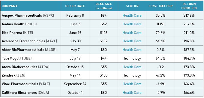 Though life sciences companies dominated the overall US IPO market in terms of both number of issuances and overall returns, individual company results showed great variation. Life sciences companies represented eight of the 10 top-performing IPOs. At the same time, five out of 10 of the worst-performing companies were smaller life science companies in competitive markets.