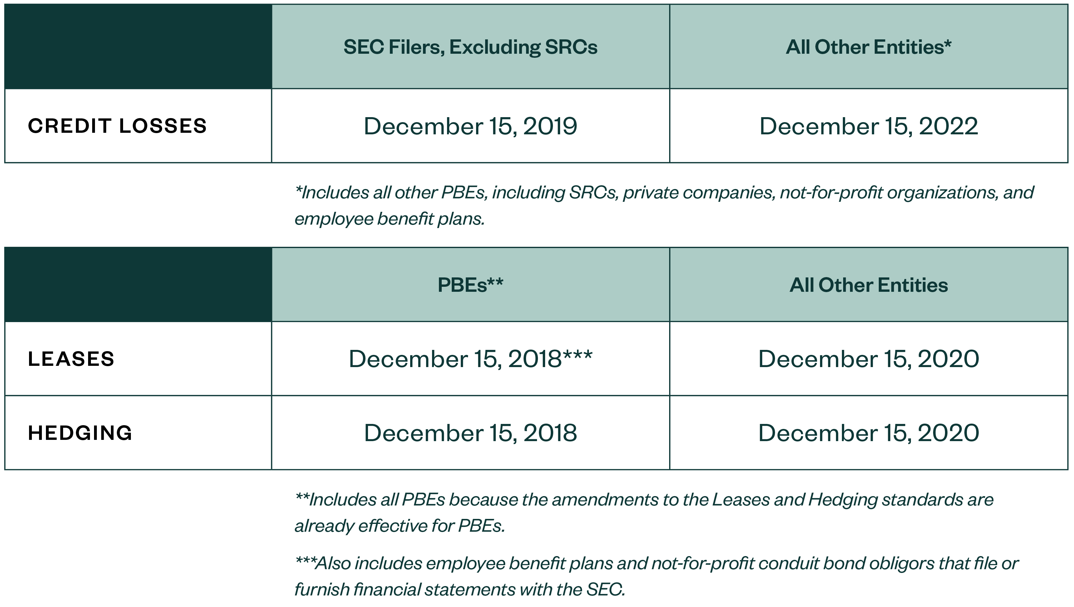 On August 15, 2019, the Financial Accounting Standards Board (FASB) issued a proposed accounting standards update to amend the dates when several major standards will become effective for private companies, not-for-profit organizations, and smaller reporting companies (SRCs). The proposal effects recently issued updates related to the following topics: