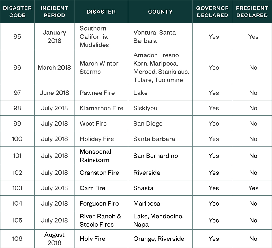 The following includes California Qualified Disasters published on the FTB website as of October 31, 2018.
