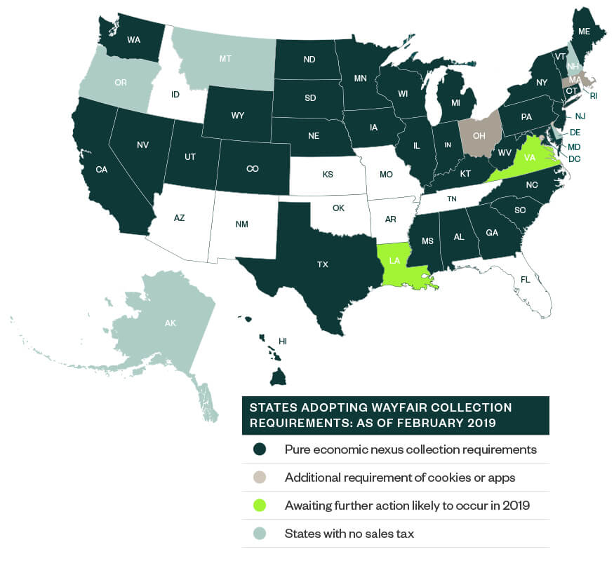 Thirty-four states have already established an economic nexus, and most states are expected to follow by the end of 2019. In December of 2018 and January of 2019 alone, California, Texas, Pennsylvania, and New York all announced their adoption of Wayfair standards. Louisiana has announced and withdrawn a Wayfair standard, but is expected to readopt a modified standard.