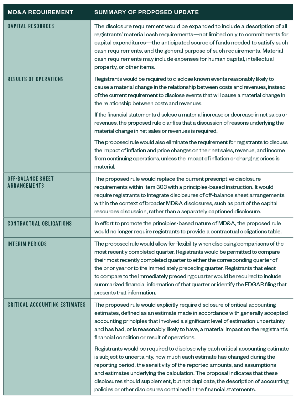 As a result of the evaluation and public outreach, the SEC is proposing certain amendments to Regulation S-K to simplify compliance efforts for registrants and focus the disclosure requirements on material, relevant information. Specifically, the proposed rule would eliminate disclosure requirements in Item 301, Selected Financial Data, and Item 302, Supplementary Financial Information, and enhance the disclosure requirements in Item 303, MD&A. Here are the key provisions.