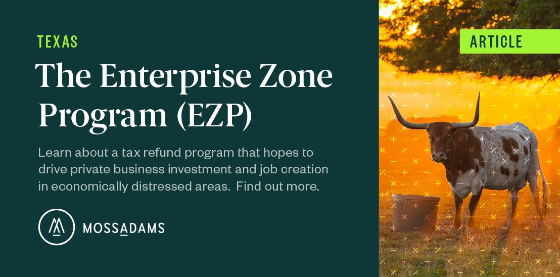 Contact your Moss Adams professional if you have questions about enterprise zones, specifically site selection projects or how to align your business expansion strategy with incentives such as enterprise zone benefits.