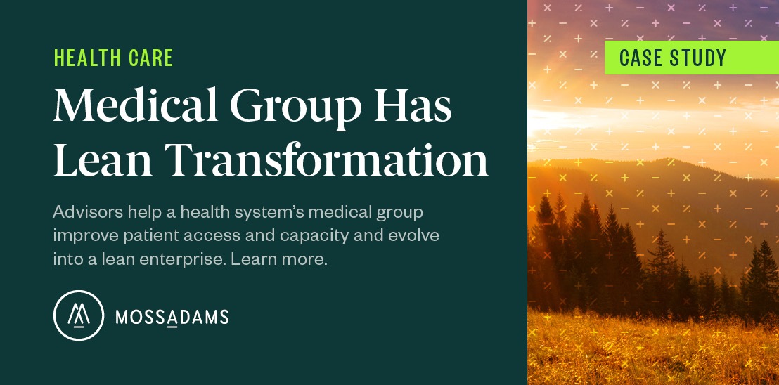 For more information on how lean methods can help your health system or medical group streamline operations, improve quality, and save money, please contact your Moss Adams professional.