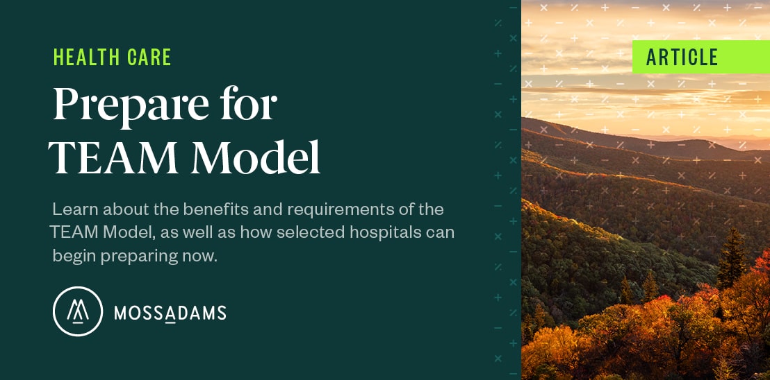 The complexity of the TEAM Model may be a significant challenge to hospitals—even those that have well-established care management programs and are familiar with value-based payments. For those that are new to risk, this model’s requirements may be daunting. The good news is the same efforts and strategies that drive overall success in health care systems will help here. Please reach out to your Moss Adams professional if you would like to join the peer group, or want assistance with: