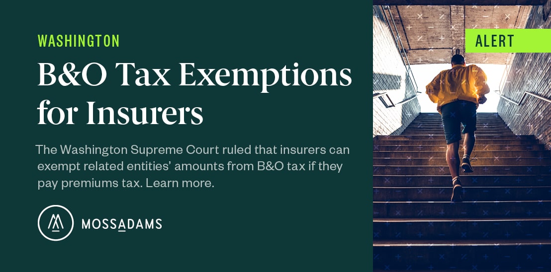 We recommend a careful review of agreements to confirm the potential impact of Envolve and whether the B&O tax exemption found in RCW 82.04.320 applies to some or all of the intercompany receipts between an insurance provider and its related administrative services entity.