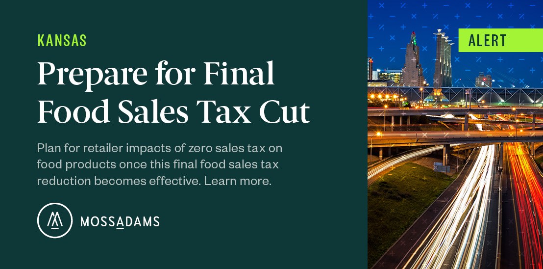If you have questions about food sales tax reductions in Kansas, please contact your Moss Adams professional.