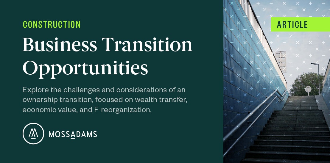 Transitioning ownership in closely held construction companies offers opportunities and challenges ranging from multigenerational wealth transfers to measuring impacts on company culture and market competitiveness.