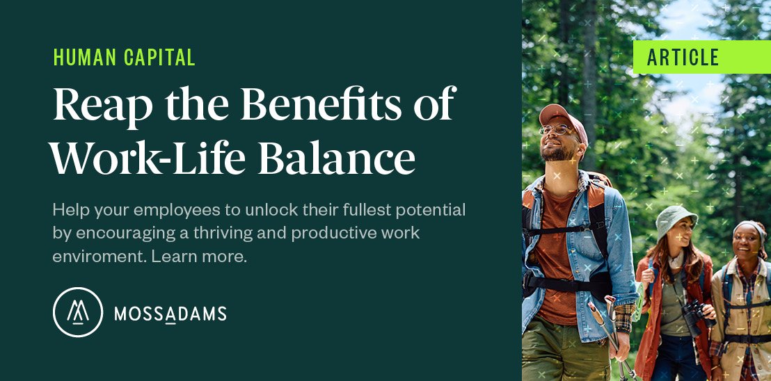 To learn more about improving employee engagement and nurturing work-life balance, contact your Moss Adams professional.