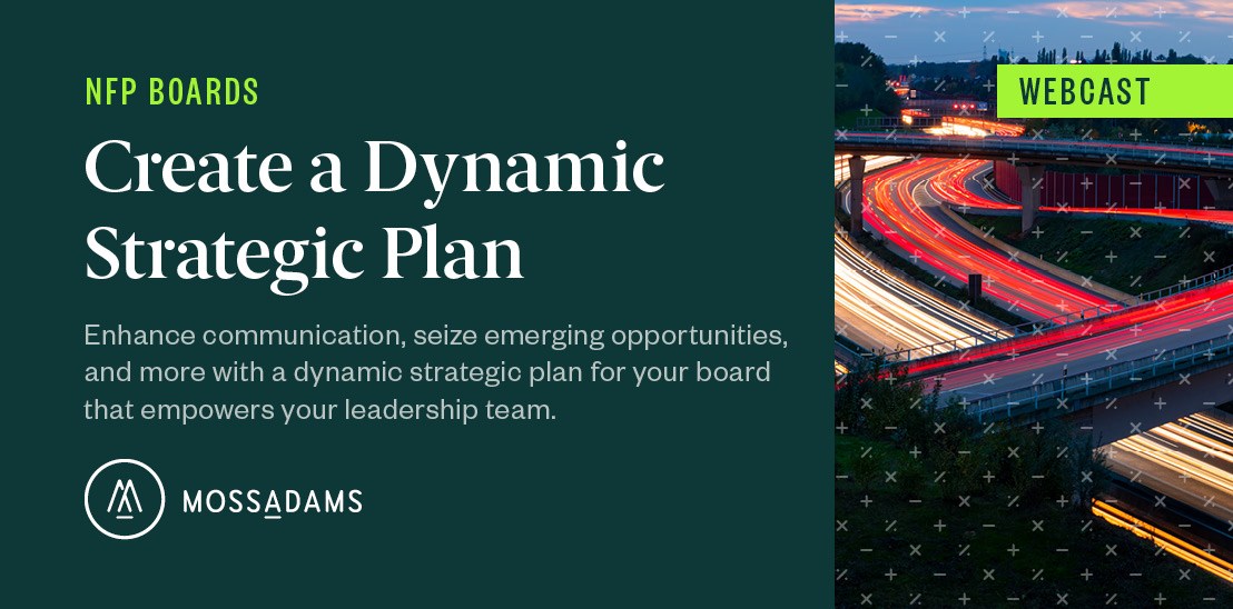 Join us for our webcast, Adaptable Strategic Planning for Mission-Driven Boards. We’ll share practical strategies for effective strategic plan development, review, and revisions. Whether you're revamping an existing plan or starting from scratch, this webcast will empower your leadership team to create an adaptable plan that won't sit on a shelf.