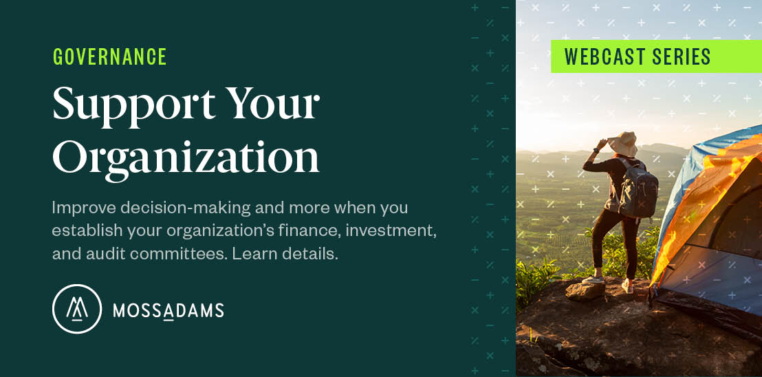 Watch our webcast, Create Effective Finance, Investment, and Audit Committees. We’ll review practices to enhance your organization's finance, investment, and audit committees, including roles, responsibilities, relationships, and decision-making models.