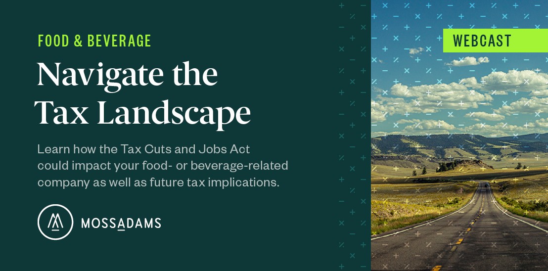Join us for our webcast, Navigate the Tax Cuts and Jobs Act for Food and Beverage, tailored specifically for the food and beverage industry, focusing on the implications of the Tax Cuts and Jobs Act (TCJA).
