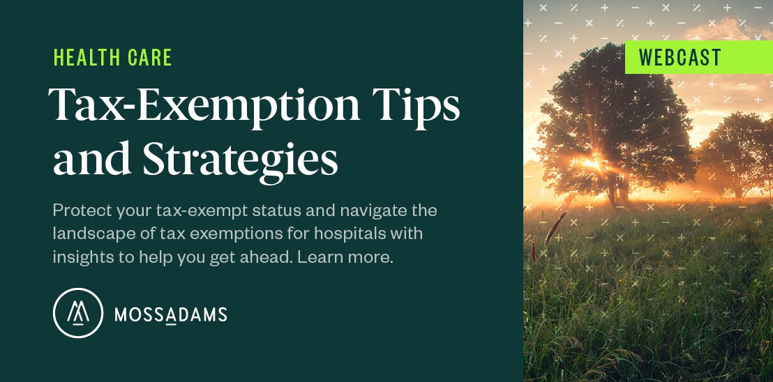 Join us for our webcast, Navigating the Landscape of Tax-Exempt Hospitals, designed for health care leaders and policy makers to address the unique concerns and perspectives of tax-exempt hospitals.