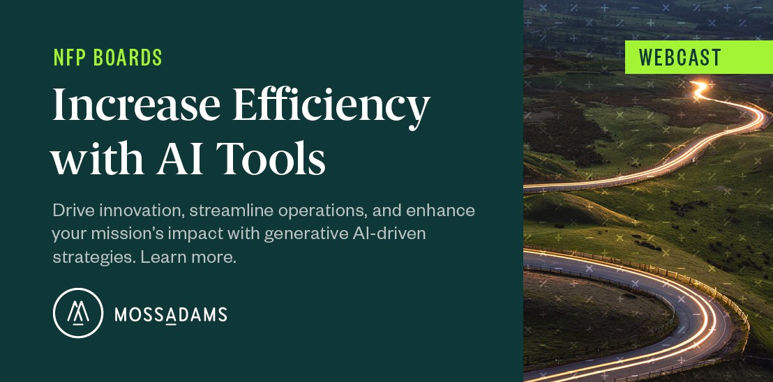 View our webcast, Not-for-Profit Boards: Drive Innovation with Generative AI. Professionals from our Generative AI Consulting Services and Not-for-Profit Practice will share proven practices for boards to adopt AI-driven strategies responsibly and effectively. You'll leave with actionable insights and real-world examples tailored to the unique challenges and opportunities facing not-for-profit leaders.