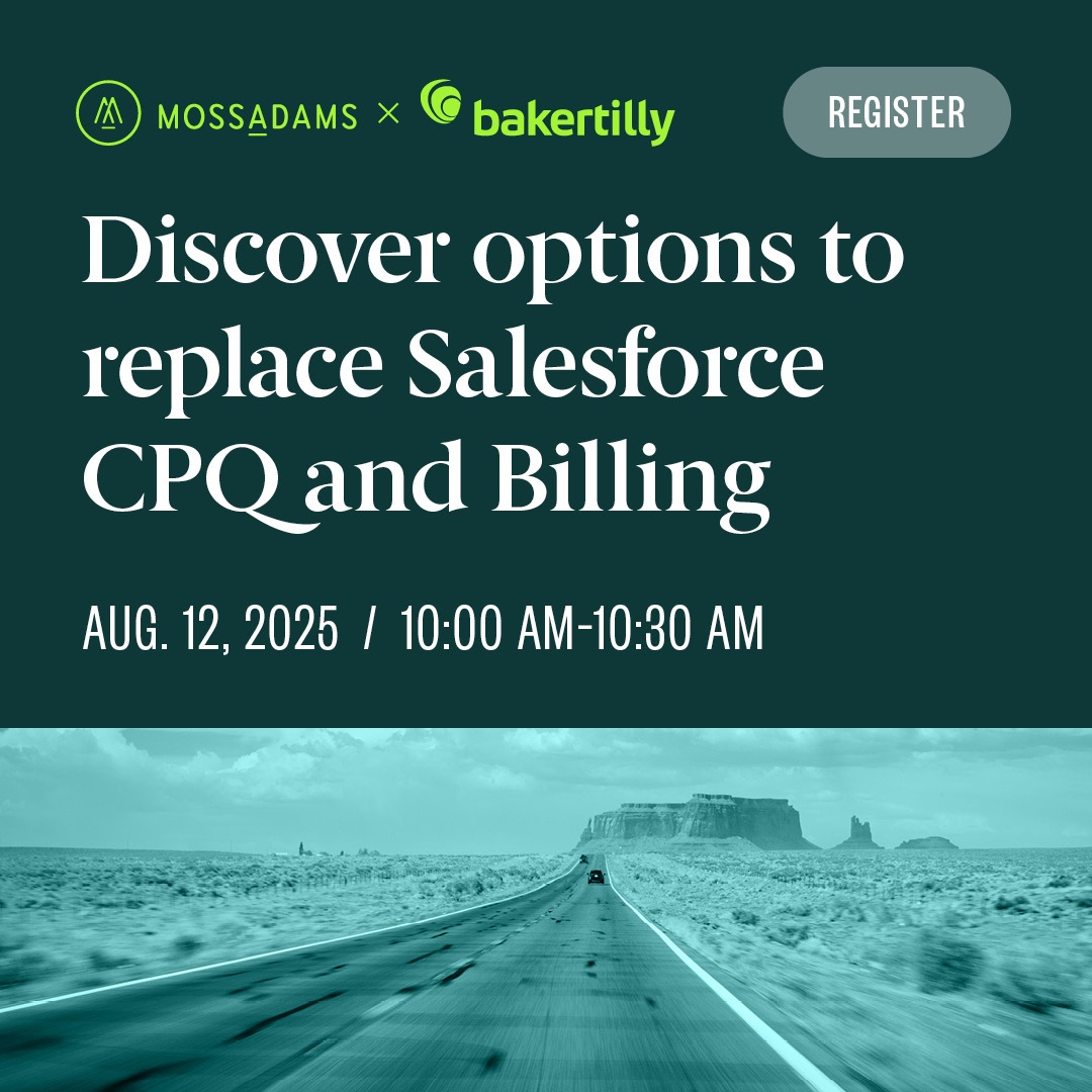 View our webcast, Sunsetting Salesforce CPQ and Billing: Your Options Ahead, to learn what the end of Salesforce CPQ and Billing means in practice and what your options are now. We’ll review before and after states with Revenue Cloud, plus potential enterprise resource planning (ERP)-native billing models and share scalable options for a path forward.