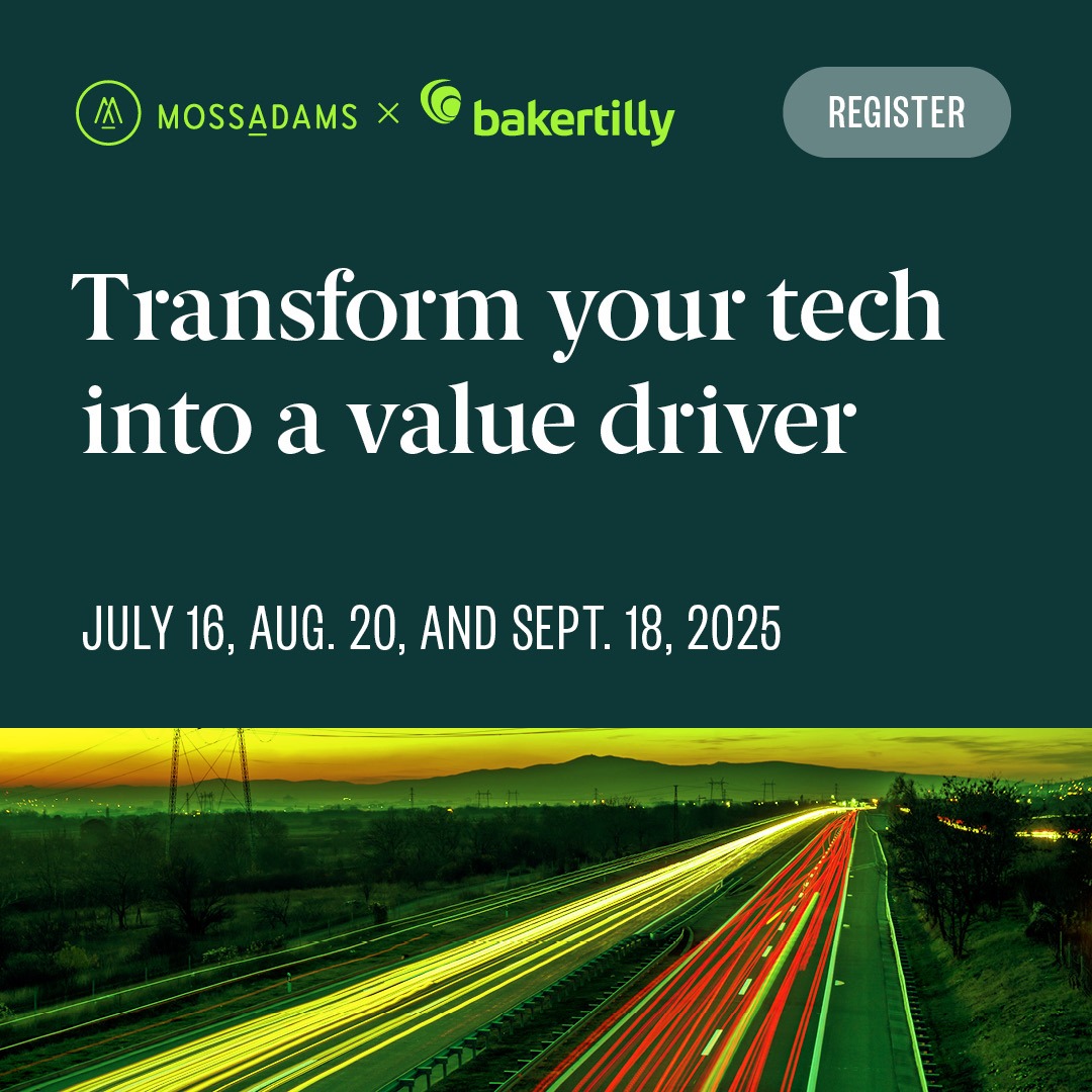 Baker Tilly US, LLP, Baker Tilly Advisory Group, LP and Moss Adams LLP and their affiliated entities operate under an alternative practice structure in accordance with the AICPA Code of Professional Conduct and applicable laws, regulations and professional standards. Baker Tilly Advisory Group, LP and its subsidiaries, and Baker Tilly US, LLP and its affiliated entities, trading as Baker Tilly, are members of the global network of Baker Tilly International Ltd., the members of which are separate and independent legal entities. Baker Tilly US, LLP and Moss Adams LLP are licensed CPA firms that provide assurance services to their clients. Baker Tilly Advisory Group, LP and its subsidiary entities provide tax and consulting services to their clients and are not licensed CPA firms. ISO certification services offered through Moss Adams Certifications LLC. Investment advisory offered through either Moss Adams Wealth Advisors LLC or Baker Tilly Wealth Management, LLC.